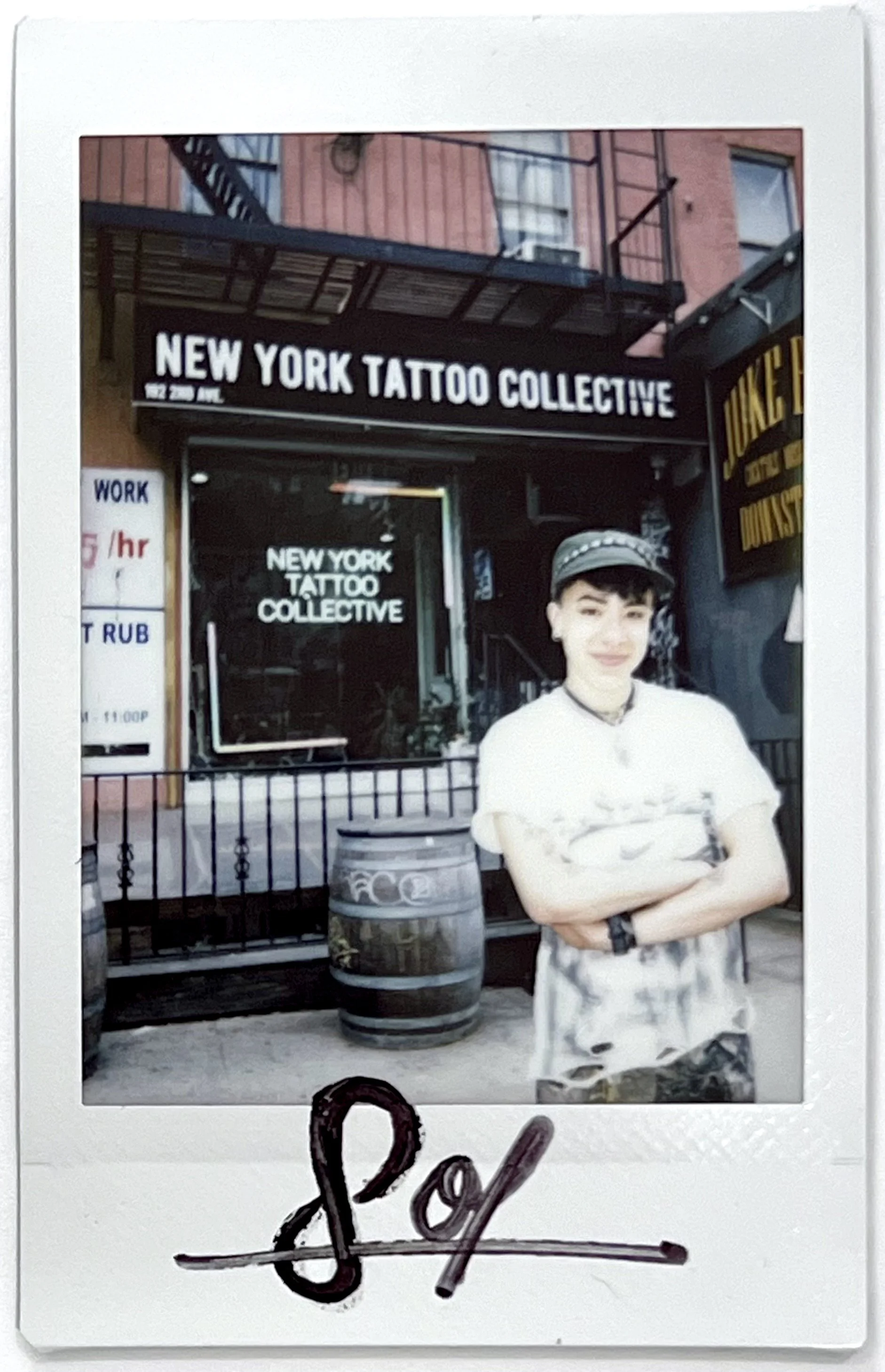 Sof (they/he) is a Mexican tatttoo artist, painter, drag artist (Xana Whoria) and leather worker.